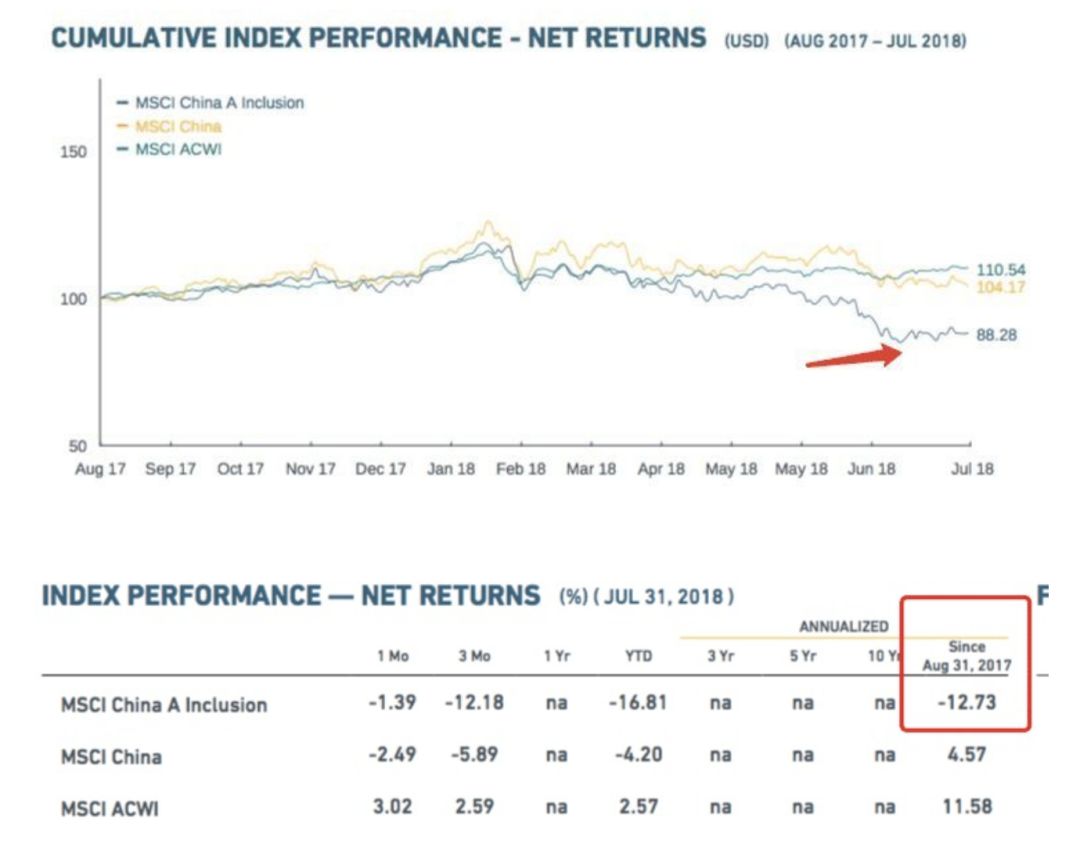截至今日(8月15日)收盘,上证指数今年以来跌幅-17.66%,深证成指跌幅-22.28%,沪深300跌幅-18.33%……MSCI官网也披露了数据,截至7月31日,反映纳入MSCI新兴市场指数的226只A股表现的MSCI ChinaA Inclusion指数自2017年8月份以来至今,下跌了12.73%。